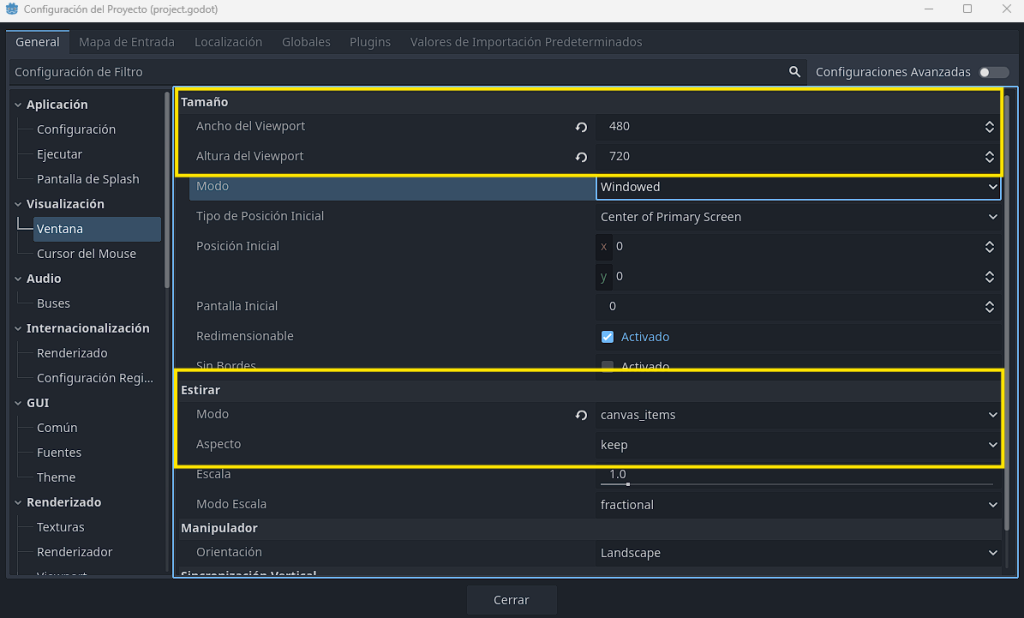 Este proyecto esta diseñado vertical, por lo que necesitamos ajustar el tamaño de la ventana. Click en Proyecto->Configuración del proyecto->General->Visualización->Ventana ahi establecemos en la sección de Tamaño “Ancho del Viewport” a 480 y “Alto del Viewport” a 720 y en la sección de Estirar “Modo” canvas_items “Aspecto” keep