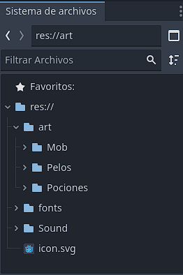 En este proyecto que no es muy grande me tome la liberta de crear las carpetas para escenas y scripts y todo sera guardado en la carpeta raiz del proyecto, identificada por res:// . Puedes ver las carpetas como iria de momento en el panel del Sistma de archivos que esta ubicado en la esquina inferior izquierda: