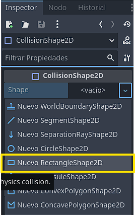 Igual que se añadio AnimatedSprite2D un nodo hijo, agregamos el nodo hijo CollisionShape2D al nodo principal de Player , para determinar el “hitbox” del jugador, o los limites de su área de colisión, para el tipo de personaje ovalado podriamos usar un nodo CapsuleShape2D , vamos al “Inspector” en la sección de “CollisionShape2D” en “vacío” selecionamos “Nuevo CapsuleShape2D“, usando los manejadores ajustamos hasta cubrir el personaje.