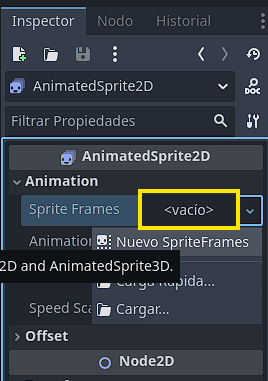 Selecionados el nodo principal Player , con Ctrl + A o clic derecho + Añadir Nodo Hijo… y creamos un nodo AnimatedSprite2D este nodo se va encargar tando de las imagenes y las animaciones de nuestro personaje, se observa una advertencia en el nodo que nos indica que demos asiganar un recurso de “Sprite Frames” que es el encargado de mostrar los fotogramas. Ahora selecionamos AnimatedSprite2D y nos dirigimos al “Inspector” ubicado lateral derecho y buscamos la propiedad “Sprite Frames” de AnimatedSprite2D en “Animation” , clic en “vacío”->”Nuevo SpriteFrames”