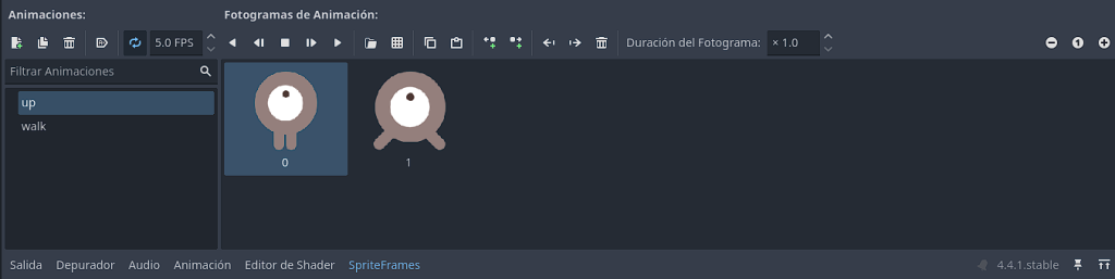 A la izquierda vamos a crear nuestra lista de animaciones, en la animación “default” le vamos a cambiar el nombre por “walk” y luego vamos añadir una nueva animación o (Ctrl + N) llamada “up”