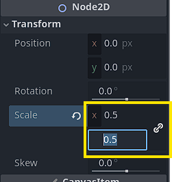 Las imagenes del personaje son muy grandes, vamos ajustar la “Scale” selecionamos el nodo principal Player vamos al “Inspector” en la sección “Node2D” en “Transform” buscamos la propieda “Scale” y ajustamos los valores de x y y en “(0.5, 0.5)“
