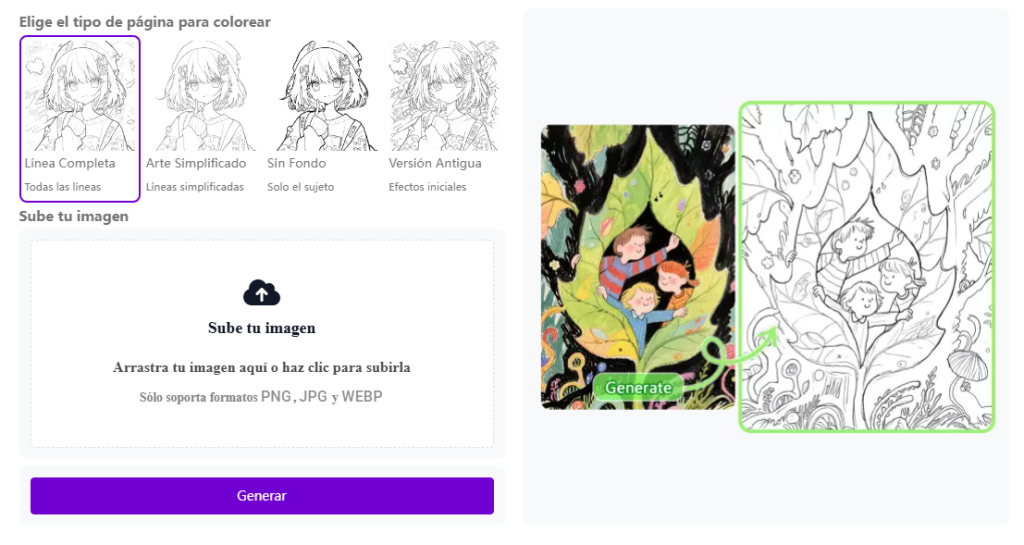 En menos de 5 segundos tendrás una página limpia con líneas perfectas para colorear. Puedes descargarla en PNG o PDF.